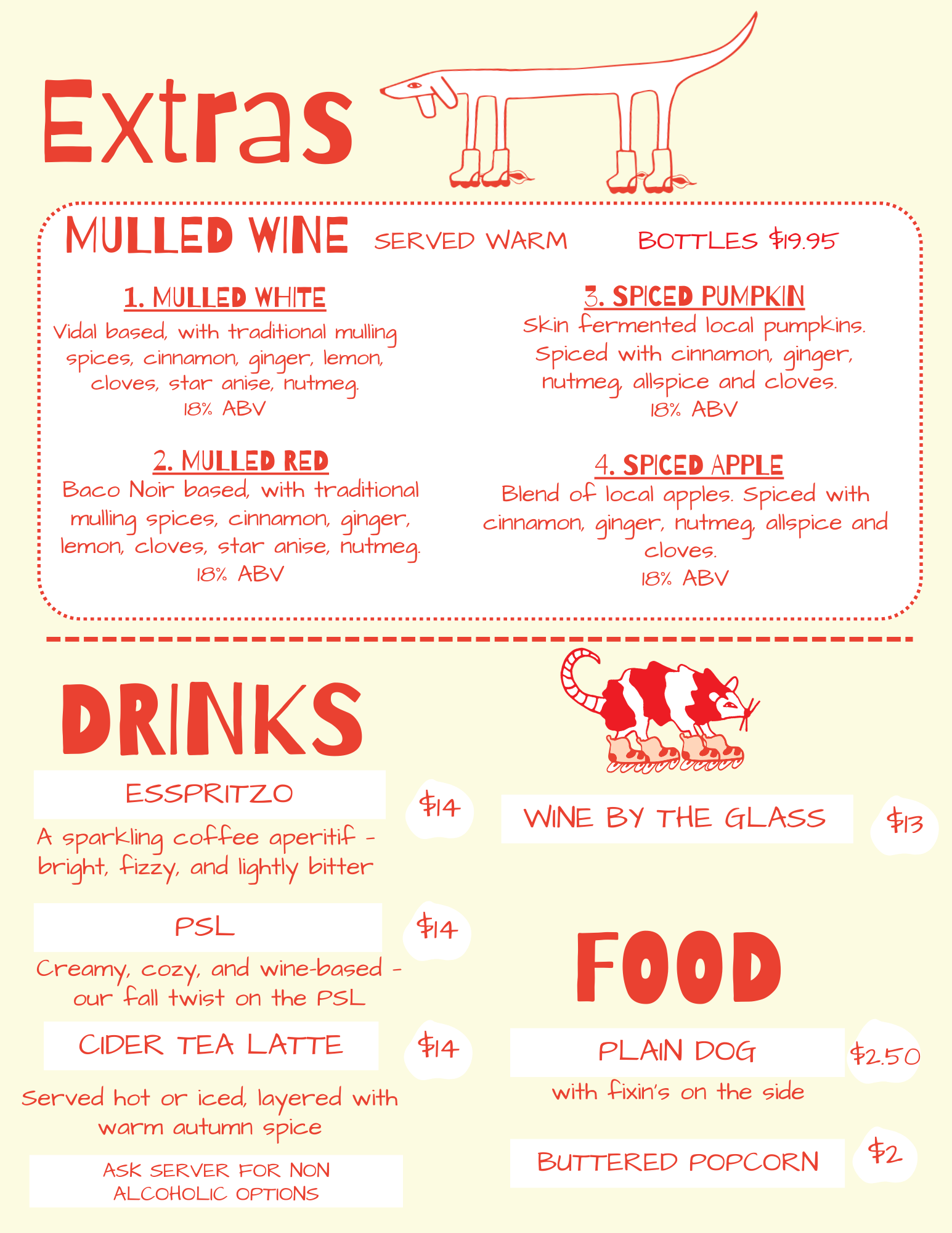 - (Fall and Winter) Try our mulled wine! Heated and fortified makes them a perfect drink for the cold seasons.