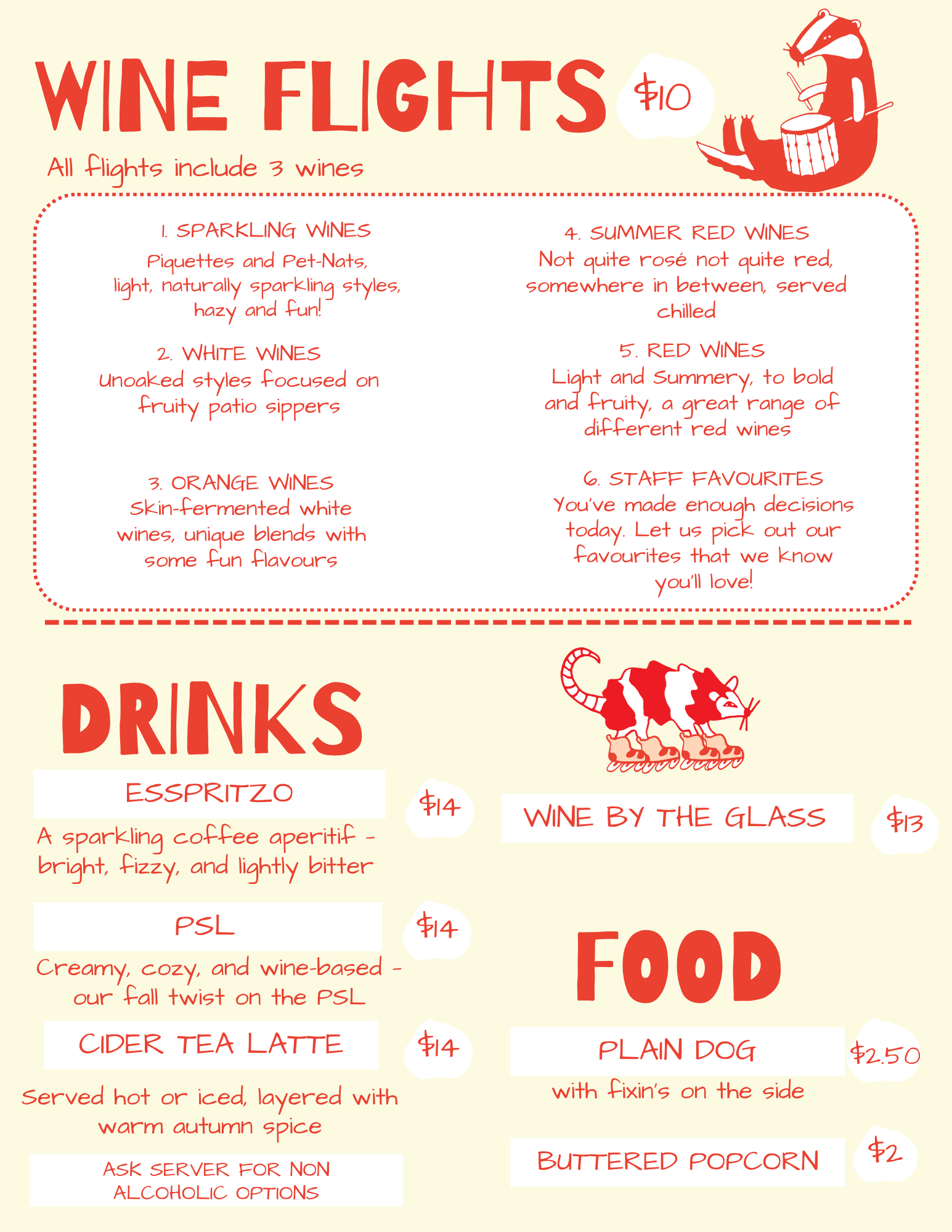 - Our wine list changes daily, typically offering eight wines for tasting at once, with surprise offerings available.